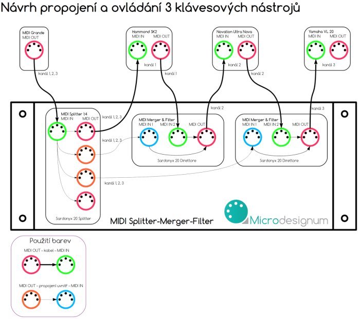 Příklad zakázkové výroby MIDI procesoru: Zákazník chtěl jedním MIDI ovladačem řídit 3 klávesové nástroje propojené do jednoho MIDI okruhu. Zároveň chtěl klávesami 1 ovládat zvuky v klávesách 2 a klávesami 2 ovládat zvuky v klávesách 3. Protože na klávesách nelze nastavit jiný přijímací a odesílací kanál, pomohlo naše zakázkové řešení.